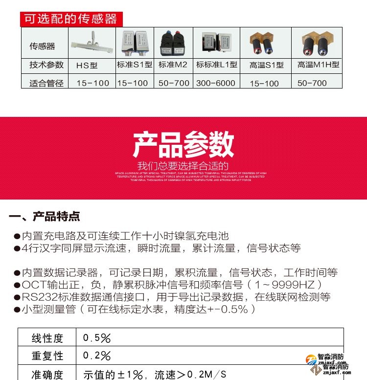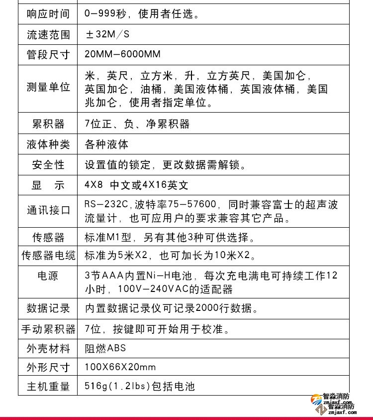 超聲波流量計測量管徑范圍:0mm~300mm;WWW.XFJCYQ.COM精度:±1%用于檢測消火栓系統(tǒng)和水噴淋系統(tǒng)的給水量以及消防豎管的流量分配。